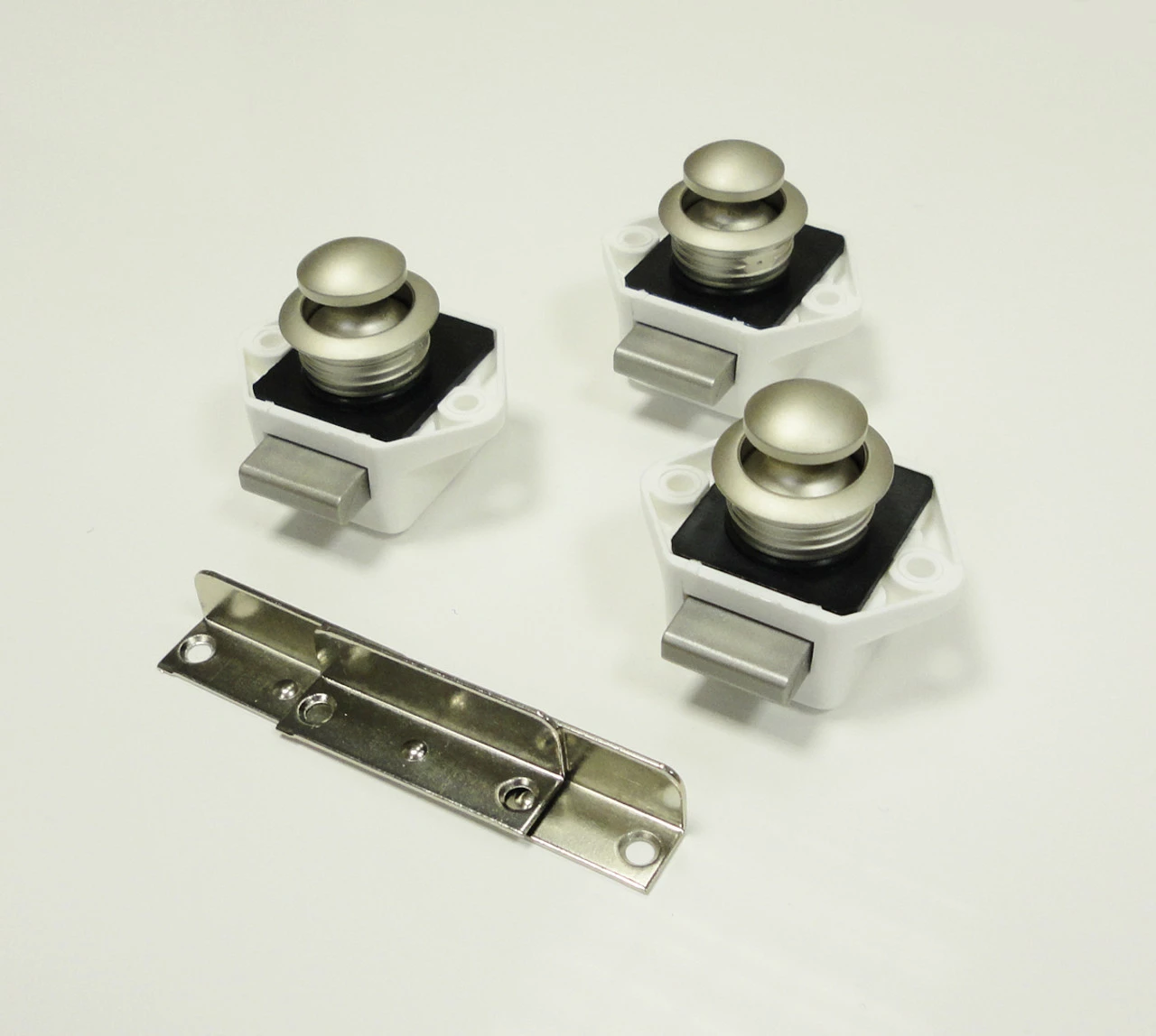 Keep the wardrobe or cupboard doors of your caravan or motorhome firmly shut with a mini push button door handle and catch.